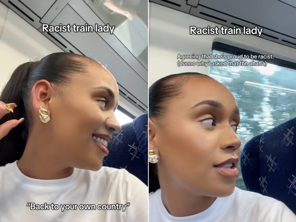 The woman moves seats before being recorded saying ‘Get back to your own country’. When the woman is challenged by Courtney and other members of public on the train she admits she’s ‘proud to be racist’